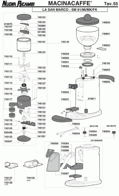 Exploded view drawings - Spares for brands. San Marco coffee grinder parts. Spares for vending payment.